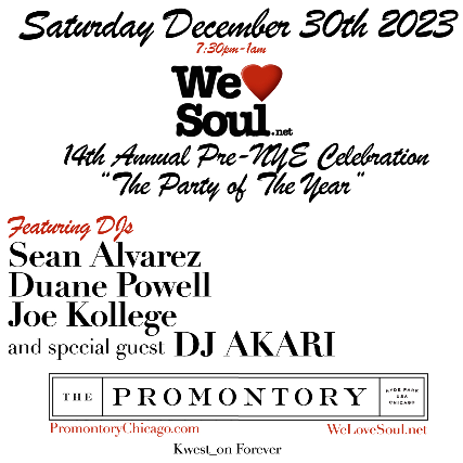 Saturday December 30th from 7:30pm-1am is We Love Soul's 14th Annual Pre-New Year's Eve Celebration also known by many as "The Party of the Year".
