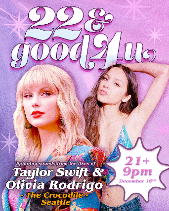 '22 & good 4 u' is a dance party for lovers of Taylor Swift and Olivia Rodrigo. We play music all night long from the likes of both artists for you to dance to!