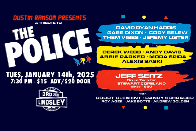 From their beginnings as a trio of jazz-trained musicians pretending to be a punk band to their meteoric rise in becoming the biggest band in the world, The Police are one of the most revered and successful artists in music history, having sold over 75 million records and winning 6 Grammys. With their unique blend of reggae, pop, jazz, world music, and funk, frontman/bass player Sting's masterful songwriting and sky-high vocals, Andy Summers's rich orchestral guitar prowess, and Stewart Copeland's colorful, sophisticated, and groundbreaking drumming, The Police created what have become some of most enduring songs of the past 50 years including "Roxanne", "Every Little Thing She Does Is Magic", and the most performed song in BMI history, "Every Breath You Take", with a whopping 15 million radio plays as of 2019 and over 2 billion streams on Spotify. Nashville musician-vocalist-producer Dustin Ransom (Chely Wright, Richard Marx, Dave Barnes, Gabe Dixon) leads a whole host of Nashville luminaries plus a vital member of The Police family - Jeff Seitz, Stewart Copeland's drum tech and assistant since 1980 - in celebrating one of the most influential musical acts of the past 50 years. This one is not to be missed.