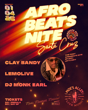 Here's the first Afrobeats Nite Santa Cruz of 2025 featuring Clay Bandy, Lemolive and DJ Monk Earl!