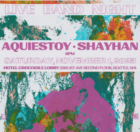 Aquiestoy and Shayhan make music for the greater good. Having met a few years ago, the two Seattle-based musicians and groove-explorers recently connected on their respective unique styles, and their processes of writing and recording music in their home studios and playing it live with bands. Join us at the Hotel Crocodile for a night of songs with some of Seattle's top independent musicians, and a release of Aquiestoy's debut single, "Daño Choca". A sweet double-bill guaranteed.