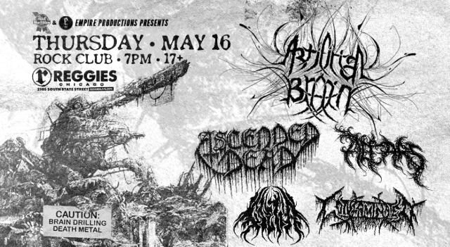 Artificial Brain are a technical death metal quintet from Long Island, New York. Their core sound weds pummeling tech and death metal to the buzzing edges and Phrygian mode scales of black metal with an angular, dissonant edge and nearly subliminal growling vocals using science fiction themes as lyric inspiration. The self-released, three-track Demo 2011 presented the band with opportunities for regional touring while 2013's Butchering Cosmic Giants EP won notice globally, netting them a record deal with Profound Lore. 2014's long-playing debut, Labyrinth Constellation, was produced, mixed, and mastered by Colin Marston; it scored dozens of positive reviews for its bracing modern approach to death metal. 2017's Infrared Horizon proved more experimental and wide-ranging, resulting in a prime slot on Cattle Decapitation's tour. Founding vocalist Will Smith left the band in September 2021. He was replaced by vocalist Paulo Paguntalan for immediate touring, though Smith's voice had already been recorded for material on 2022's Artificial Brain. ~ Thom Jurek, Rovi