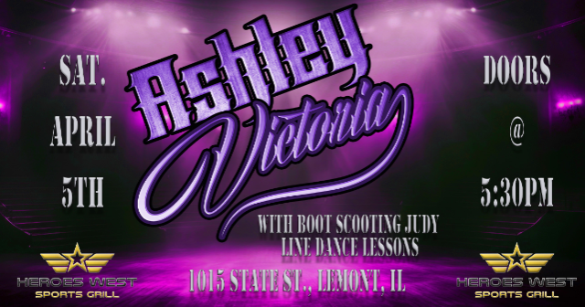 Ashley Victoria Band is performing on Saturday, April 5th at Heroes West in Lemont. Boot Scootin Judy Rice will be teaching line dancing lessons. Come early for dinner and stay for the show! This is a 21+ Event