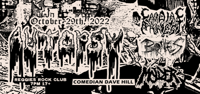 Formed in 1987 by Chris Reifert and Eric Cutler. Danny Corralles joined in 1988. Dis-banded in 1994, the group has been Awakened by Gore and have returned to continue their brutal assault on the metal scene. In a short time Autopsy has released the E.P. "The Tomb Within," Full Lengths "Macabre Eternal" and "The Headless Ritual" and the comp plus E.P. "All Tomorrows Funerals." To be released April 2014, a new full length record from Autopsy titled "Tourniquets, Hacksaws & Graves" comes to crush and continue what Autopsy does best, play death metal.