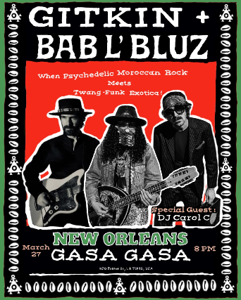 A special collaborative night featuring New Orleans based twangist Gitkin and Moroccan psychedelic rockers Bab L’ Bluz.