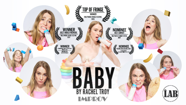 Rachel Troy has a baby inside of her. But she’s not pregnant. It’s her, she’s the baby. BABY is a clown tragicomedy about the inner child, attachment theory, and therapy. Performed by a real-life therapist… Clever, yet totally stupid, this show is an absurd psychological carousel with fun audience interactions, and theatrical, comedic, and poignant surprises at every turn! BABY won Top of Fringe, Best World Premiere, and was nominated for Best Comedy at the 2024 Hollywood Fringe Festival. Come see what audiences are calling “Actually genius, genre-breaking, fierce, and fucking hilarious!” Content Warning: Brief Partial Nudity