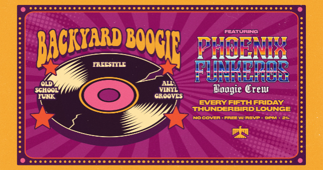Come out for Backyard Boogie Feat. Phoenix Funkeros. Get your groove on to some old school funk, freestyle, and all vinyl funky groves! This is a fun laid back crowd. Come hand with us for funky groovy backyard boogie Friday night!