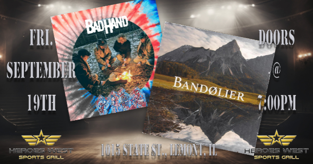 Bandolier and Bad Hand are performing on Friday, September 19th at Heroes West in Lemont. Come early for dinner and stay for the show! This is a 21+ Event