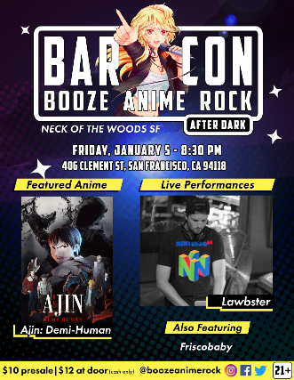 Bar Con: After Dark 1st Fridays @ Neck of the Woods SF This month features performances by: Lawbster & Frisco Baby This month's featured anime: Ajin: Demi-Human Friday January 5th 2024 Neck of the Woods 406 Clement St San Francisco, CA 94118 $10 in advance $12 at the door 8pm 21+