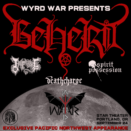 Wyrd War in conspiracy with NWN! proudly deliver legendary Finnish black metal progenitors BEHERIT to the Pacific Northwest for the first time ever! Formed in 1989 in the northernmost region of Lapland, at the icy fringes of the Arctic Circle, by Nuclear Holocausto Vengeance, Sodomatic Slaughter and Demonic Fornication, the band recorded several chaotic demos that were released in 1991 as the unofficial but hugely influential masterpiece The Oath of Black Blood before releasing their comparatively experimental debut full length Drawing Down the Moon in 1993. The band has continued to evolve over several decades and creative eras to produce an avant-garde body of work that has never strayed thematically from its occult Satanic origins. BEHERIT returns to unholy form in 2025 to desecrate American soil for the first time in the band's nearly 40 year legacy. OPEN THE GATES OF NANNA!