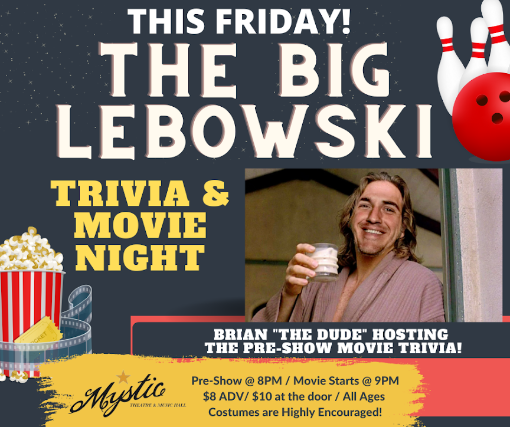 Friday, September 23rd. Pre-Show @ 8PM. Movie Starts @ 9PM Drink Specials during the Pre-Show. $8 advance/ $10 at the door Rated R. Running Time: 2hrs. Don't miss our pre-show movie trivia! Audience participation and costumes encouraged! Check out our  special White Russian menu! ********** Main Feature: The Big Lebowski (1998) 1998 comedy neo-noir crime film written, produced, and directed by Joel and Ethan Coen. It stars Jeff Bridges as Jeffrey "The Dude" Lebowski, a Los Angeles slacker and avid bowler. He is assaulted as a result of mistaken identity, then learns that a millionaire also named Jeffrey Lebowski was the intended victim. The millionaire Lebowski's trophy wife is kidnapped, and millionaire Lebowski commissions The Dude to deliver the ransom to secure her release; the plan goes awry when the Dude's friend Walter Sobchak conspires to keep the ransom money. Sam Elliott, Julianne Moore, Steve Buscemi, John Turturro, Philip Seymour Hoffman, Tara Reid, David Thewlis, Peter Stormare, and Ben Gazzara also appear, in supporting roles. The film has become a cult favorite, noted for its eccentric characters, comedic dream sequences, idiosyncratic dialogue, and eclectic soundtrack.