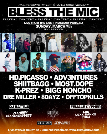 BLESS THE MIC * MARCH 7th * GARDEN STATE HIP-HOP, ALPHA CODE & HEAVYHITTAS PRESENT BLESS THE MIC VIRTUAL CONCERT LIVE from THE SAINT feat. HD.PICASSO, ADV3NTURES, SHIITBAGG, MOST.DOPE, K-PREZ, BIGG HONCHO, DRE MILLER, 8DAYZ, OFFTOPKILLS, DJ BATTLE, DJ REEM, DJ SOWAVVEYY, FEMALE CYPHER, ABE, LEXX BANKO, POCA and MORE. Tickets $5.00. in advance and day of show.