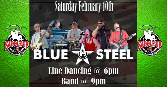 Join us on Saturday, February 10th when Blue Steel performs at Saddle Up @ Q. Line dance lessons start at 6pm and the band takes the stage at 9pm.