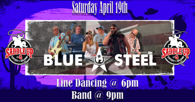 Join us on Saturday, April 19th when Blue Steel performs at Saddle Up @ Q. Line dance lessons start at 6pm and the band takes the stage at 9pm.
