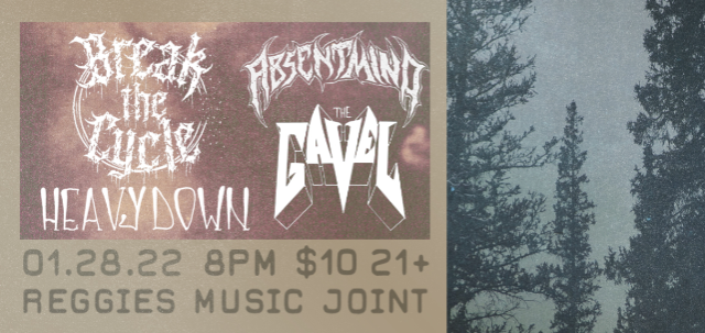 Starting January 3, anyone entering the concert will be required to show proof of full vaccination. Final dose of vaccination must be received no less than 14 days prior to the event. We will accept a hard copy of your vaccination card, a printed photocopy or a digital image on your phone, and must match your Government-issued ID. Masks are currently required to be worn by everyone inside the venue in accordance with current City of Chicago guidelines. Reggies Music Joint 8pm doors / 9pm show / 21+ / $10  Empire Productions presents:  Break The Cycle Absent Mind Heavy Down The Gavel