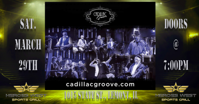 Cadillac Groove is performing on Saturday, March 29th at Heroes West in Lemont. Come early for dinner and stay for the show! This is a 21+ Event