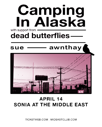 The Middle East presents: Camping in Alaska, Dead Butterflies, Sue, Awnthay - 18+, $20 Advance / $25 Day of Show, 6:30 PM Doors