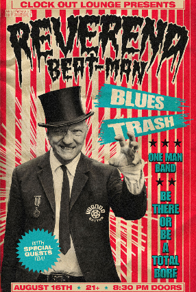 "He’ll make your back crack, your liver quiver, and your knees freeze. And if you don’t dig that you’ve got a hole in your soul, so let’s give a big warm welcome for the Rev, your Beat-Man, everybody’s Blues Trash Preacher, the fabulous Reverend Beat-Man"