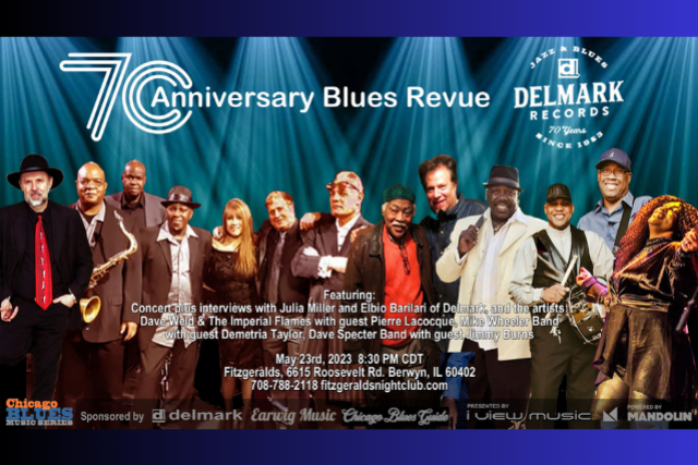 Delmark Records 70th Anniversary Blues Revue, 5/23/2023  Directed by FRED UHTER Featuring:  Dave Weld & The Imperial Flames with guest Pierre Lacocque Mike Wheeler Band with guest Demetria Taylor Dave Specter Band with guest Jimmy Burns Here’s a chance to see the venerable Chicago label Delmark Records 70th Anniversary Blues Revue concert filmed last October. The concert was an epic night of blues that we think you will enjoy. Three prominent acts from the Chicago label’s roster are featured, as well as revealing interviews with Julia Miller and Elbio Barilari of Delmark, Michael Frank of Earwig Music, and the performing Delmark artists. First, the original driving blues, boogie and soul of Dave Weld & The Imperial Flames hits the stage with guest artist, harmonica player Pierre Lacocque. Then, the versatile Mike Wheeler Band delivers “old school for the new century” (Blues Blast), joined by singer and Blues Music Award nominee Demetria Taylor. The evening closes with the “Global Ambassador of Chicago Blues” (Chicago Sun-Times) Dave Specter, his Dave Specter Band with the living legend and guitarist/singer Jimmy Burns.   With more than 2 hours of musical history, the “Delmark Records 70th Anniversary Blues Revue” will be screening at 8:30 pm cdt on Tuesday May 23rd at 8:30 pm cdt, Fitzgerald’s, 6615 Roosevelt Rd. Berwyn, IL 60402 708-788-2118 fitzgeraldsnightclub.com.