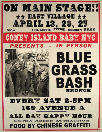 RSVP to RSVP@coneyislandbabynyc.com for admission! FREE - Every Saturday 2-5PM!! Coney Island Baby Bluegrass Bash. All Day Happy Hour until 6pm. (Limited) Food Menu available from Chinese Graffiti.  Bluegrass players welcome!  ______________________________ House Band April 13 Zach Williams - Guitar Urs von Arx - Banjo Joe Scott - Mandolin Larry Legend - Bass April 20 - May 4 Cesar Moreno - Mandolin Urs von Arx - Banjo Zach Williams - Guitar Casey Davidson - Bass
