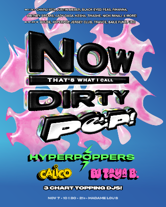Dirty Pop is a dance party blending original Pop music with Club remixes! Join us on the dance floor as we sing along to Charli, Britney, Kesha, Gaga, & RiRi! Sweat it out to rhythms from the UK, New York, Berlin, Ibiza, and Brazil ๐