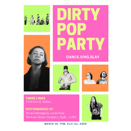 Dirty Pop Party is coming to Three Links Deep Ellum March 28 with perfomances by: We are Menagerie, Loren Kole, The Ever Flower Company, RIJAH, and J-LINE!