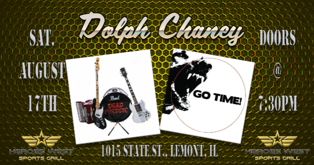 Dolph Chaney & The Phins, Dead Freddie, and Go Time! are performing on Saturday, August 17th at Heroes West in Lemont. Come early for dinner and stay for the show! This is a 21+ Event