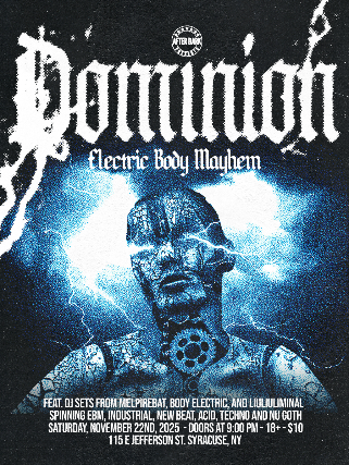 Join us for Dominion: Electric Body Mayhem, a high energy evening of EBM, Industrial, New Beat, Acid, Techno and Nu Goth, this one is for the dance floor participants who exist within thick fog and heavy strobe lights.