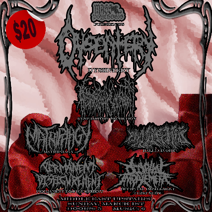 The Middle East presents: Dysentery, Respiratory Secretion, Matriphagy, Hallucivore, Permanent Disfigurement, Occipital Impalement - All Ages, $20, 5:00 PM Doors