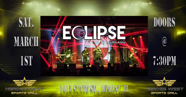 Eclipse is performing on Saturday, March 1st at Heroes West in Lemont. Come early for dinner and stay for the show! This is a 21+ Event