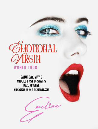 The Middle East presents: EMELINE, DEZI, REVERSE PATHOGEN - All Ages, $20 Advance / $25 Day of Show / $50 VIP + GA, 7:00 PM Doors VIP guests will enjoy: Exclusive early entry into the venue A private listening party of an unreleased single unique to their location A limited-edition Emotional Virgin VIP laminate Priority access to the best viewing areas A photo moment with EMELINE EMELINE Swag Intimate Q&A First access to tour merch NO VAPING OR SMOKING IN THE BUILDING ​*** DINE and SKIP the Line ***