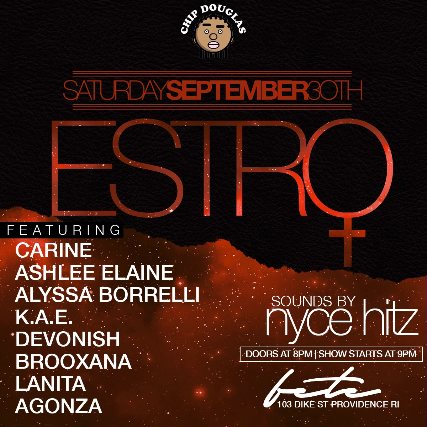 Chip Douglas presents ESTRO, the region’s premiere musical showcase featuring phenomenal women. Come and vibe out with Carine, Ashlee Elaine, Alyssa Borrelli, K.A.E., Devonish and Brooxana with Nyce Hitz providing the tunes. The talented Lanita LeBron and Agonza will also be there displaying there amazing art work. Tickets are $10 in advance and $15 at the doors. And as always come in peace.