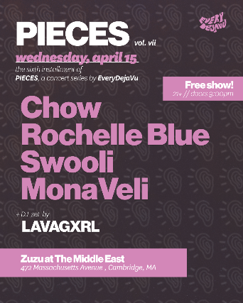 The Middle East & ZuZu & EveryDejaVu Presents: PIECES ft. Chow, Rochelle Blue, Swooli, MonaVeli, & DJ Lavagxrl - 21+, No Cover, 9:00 pm doors