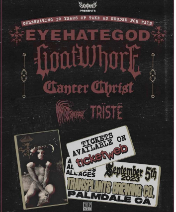 EYEHATEGOD WITH GOATWHORE/CANCER CHRIST/WHATSDYSMORPHIA AND TRISTE SEPT 5TH IN PALMDALE AT TRANSPLANTS