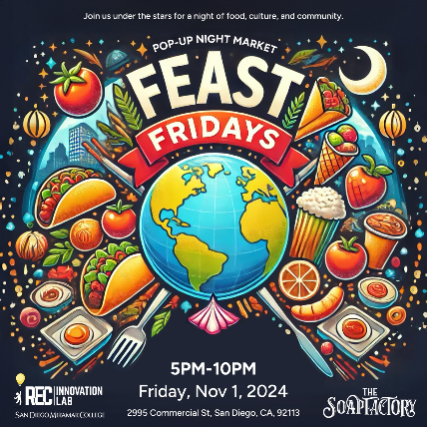 Feast Fridays Night Market is a vibrant monthly celebration of global cuisine, happening every first Friday of the month at The Soap Factory. In partnership with the Miramar College Entrepreneurship Program, this food market showcases the culinary creations of local food vendors and budding entrepreneurs. With over 25 food vendors representing five distinct regions - North America, Latin America, the Middle Eastern, and Asia - each area is thoughtfully designed to reflect the culture and ambiance of its region.