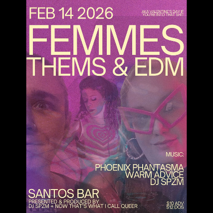 Produced & presented by DJ SPZM and Now That’s What I Call Queer, Femmes, Thems, and EDMs is dance music curated by dolls, for dolls — emotional builds, lush basslines, and tracks meant to be felt in the body. This is about intimacy on the dance floor: eye contact, sweat, release, and movement that connects you to yourself and each other.