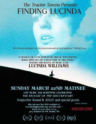 Music lovers and Lucinda Williams fans are invited to an inspiring Matinee event that blends live performance, documentary screening, and conversation as Finding Lucinda comes to The Tractor Tavern. This show celebrates the early life, creative spark, and lasting influence of the legendary singer-songwriter Lucinda Williams. To start the event, ISMAY and special guests will be performing Lucinda Williams songs.