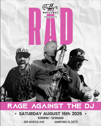 Tuffy's Music Box Presents: RAD - Rage Against the DJ Saturday August 16th, 2025 Rage Against the DJ is the ultimate DJ + Live Band collab! This drummer vs DJ combo is the perfect night out! FREE SHOW -- NO Tickets Needed! Doors 8PM Show 9PM 21+
