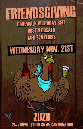 Friendsgiving Eve 2018 w/ cakewalk, Dustin Rosata, MFD b2b Eludis - 21+, $10 GA / $5 with can donation, 10:00 pm doors