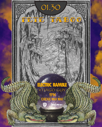 Fête Taboo returns....and we're ready to break all of the rules! Electric Ramble + Tiago Guy take over Chickie Wah Wah on January 30, 2026 for a night where the grooves lean a little left of the ordinary! Fête Taboo returns....and we're ready to break all of the rules! Electric Ramble + Tiago Guy take over Chickie Wah Wah. A night where the grooves lean a little left of the ordinary!