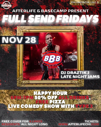 πŸŽ‰ Full Send Fridays at Basecamp πŸŽ‰   πŸ“ Basecamp, Lisle IL | πŸ“… Friday, November 28 | πŸ”ž 21+ Show   Kick off the weekend with a full send! Join us every Friday at Basecamp for a stacked lineup of food, drinks, music, and late-night vibes. πŸ•“ Doors Open: 4:00 PM Type 2 Comedy Show:  7:00 PM to 9pm πŸ• Free Pizza Slice: 5:00–7:00 PM with purchase of any drink 🍻 Happy Hour: 6:00–7:00 PM β€” 50% OFF all drinks!   🎸 Live Bands: Big Bang Baby β€” Stone Temple Pilots Tribute πŸ•— Live Music Starts: 8:00 PM   🎟️ Tickets: Available now at www.afterlifechi.com But don’t stop there...   🎧 LATE NIGHT DJ PARTY From 11:00 PM to 2:00 AM, Draztik J takes over for a high-energy dance floor experience you don’t want to miss.   πŸ’₯ FREE COVER for all 4 Lakes Residents with valid ID πŸ“ 21+ to enter