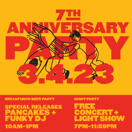 A Special Beer Tasting and Pancake Brunch event to Kickoff our 7th Anniversary. Join us and taste a rare selection of barrel-aged stout variants beers from our cellar and more. The beer lineup will include 6+ 4oz Pours of Beer, including 7x7x, our 7th Anniversary IPA, 5 new exclusive variants of Barrel-aged Stouts & more. Tickets also include: Pancakes & Sausage (vegan option available) from local favorite Miller Butler Special Brouwerij West 19oz Cidra Cooler Glass Brewery Tours from our Brewmaster & production team First 150 Ticket Buyers will also receive a live-printed Canvas Tote with your choice of 3 designs Funky DJ Set Tickets are limited, so advance purchase is suggested. Beer Tasting Ticket is 21 & Up. *There is also a Pancake & Sausage Only "Designated Eater" Ticket Available for $10 - no age restriction on the food-only tickets.* Tickets will be $5 more at the door if any tickets remain available. Our Tasting Room will also be open all day until midnight, with additional beers, hard seltzers, and slushies available for purchase, as well as food trucks. DJs will be performing all day, and FREE Live Music starts at 7pm - featuring @levitation_room, @rogebrasil, and @dreamphases and will be accompanied by the Mad Alchemy Liquid Light Show. DJ @al_lover will be on-site and CaliMucho will be live-printing more merch in the evening.