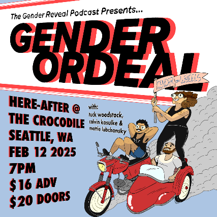 For seven years, Tuck Woodstock has hosted the beloved trans podcast Gender Reveal. Now, we dare to ask the question: What if instead of “interviews” and “guests” and “thoughtful analysis,” Gender Reveal was a series of high-concept games and bits presented by Tuck and his two most available friends? Expect comics (both kinds), historical personal ads, lightly coerced transitioning, and something called “Jeremiah AFAB Sweatpants.” No prior podcast knowledge needed, but being gay is encouraged.