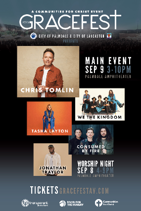 GRACEFEST 2023 returns with an all-star lineup!. Christian music’s Grammy and Dove Award winner Chris Tomlin will headline along with We The Kingdom, Tasha Layton, Consumed By Fire, and Jonathan Traylor! It’s the 15th annual celebration so join us for an unforgettable weekend of worship with community, family, friends, and faith. This year’s GraceFest takes place on Saturday, Sept 9th at the Palmdale Amphitheater and Worship Night returns on Friday, September 8th. We can’t wait to see you there!
