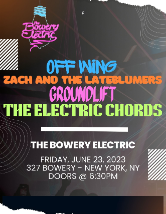 Groundlift Groundlift is a power trio hailing from the cold streets of Boston.  The joining of their three varied music tastes resulted in a fresh, unique sound where Ace’s love of beautiful melodies, Mike’s adventurous Queen-like writing style, and Leah’s unbridled technical prowess all shine.   Starting at Berklee College of Music, they are three musicians obsessed with their craft, allowing each other to fire on all cylinders with no holds barred. Combining tasty and inventive licks with melodic hooks, surreal lyrics, shredding guitar-drum-AND bass solos, and a rhythmic tightness, Groundlift is a band unlike any other.   Serving the music is Groundlift’s only goal. In a world where many things are fake and manufactured, Groundlift aims to rise above the norms and bring people a unique, honest, and contemporary rock experience. Now with their latest collaboration with producer Steve Evetts, the trio has honed their sound into a mix of hard rock, funk, progressive rock, and Brit-pop glory. Zach and the Lateblumers Zach Blumenfeld (vocals/guitar), Kaushik Goswami (bass) and Josh Obear (drums) were members of the backing band for their law school's parody musical group. Austin Lyons (guitar) went to their shows for the open bar. One day, they decided to join forces and shift their focus from songs poking fun at Supreme Court justices to songs poking fun at Zach's sadboi heart. Better late than never! The Electric Chords We are a modern power trio with a soulful, energizing sound that is as original as it is classic. We incorporate rock, blues, funk, into our soulful original music. Off Wing  Rock band from Boston/NYC! Blending together the sounds of alternative, classic, surf, and punk. See you out there! 🤙