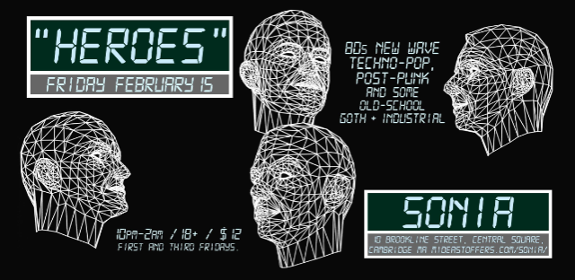 The Middle East presents: "HEROES" - 18+, $12 Advance / $12 Day of Show, 10:00 PM Doors Boing Boom Tschak! "HEROES" falls to Earth on Friday February 15 for another evening of Music Non-Stop at Sonia in Central Square, Cambridge MA. 80s NEW WAVE, TECHNO-POP, POST PUNK and some Old-School Goth & Industrial with DJ Chris Ewen, Terri (Teresa Niedzwiecki) and your Hostess Xtine Santackas. Video Projections: Mike Fulham. 10pm-2am. 18+. $12. LET'S DANCE! "HEROES": FIRST & THIRD FRIDAY of each month at SONIA - 10 Brookline Street, in Central Square, Cambridge MA. www.mideastoffers.com/sonia/ •• Please feel free to share this invitation with your friends! ••