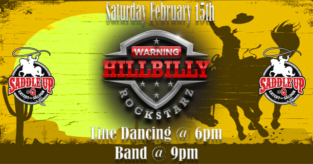 Join us on Saturday, February 15th when Hillbilly Rockstarz performs at Saddle Up @ Q. Line dance lessons start at 6pm and the band takes the stage at 9pm.