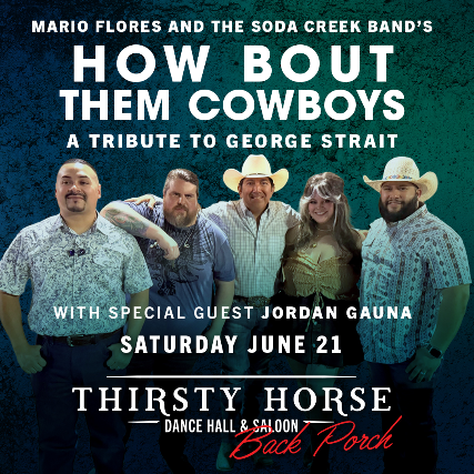 Join us Saturday, June 21 for How Bout Them Cowboys, a George Strait tribute by Mario Flores & The Soda Creek Band with special guest Jordan Gauna! 🤠