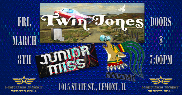 Huēhuecoyōtl, Twin Jones & Junior Miss are performing on Friday, March 8th at Heroes West in Lemont. Come early for dinner and stay for the show! This is a 21+ Event
