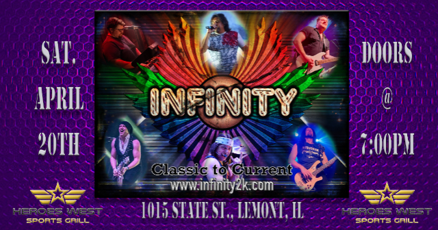 Infinity are performing on Saturday, April 20th at Heroes West in Lemont. Come early for dinner and stay for the show! This is a 21+ Event